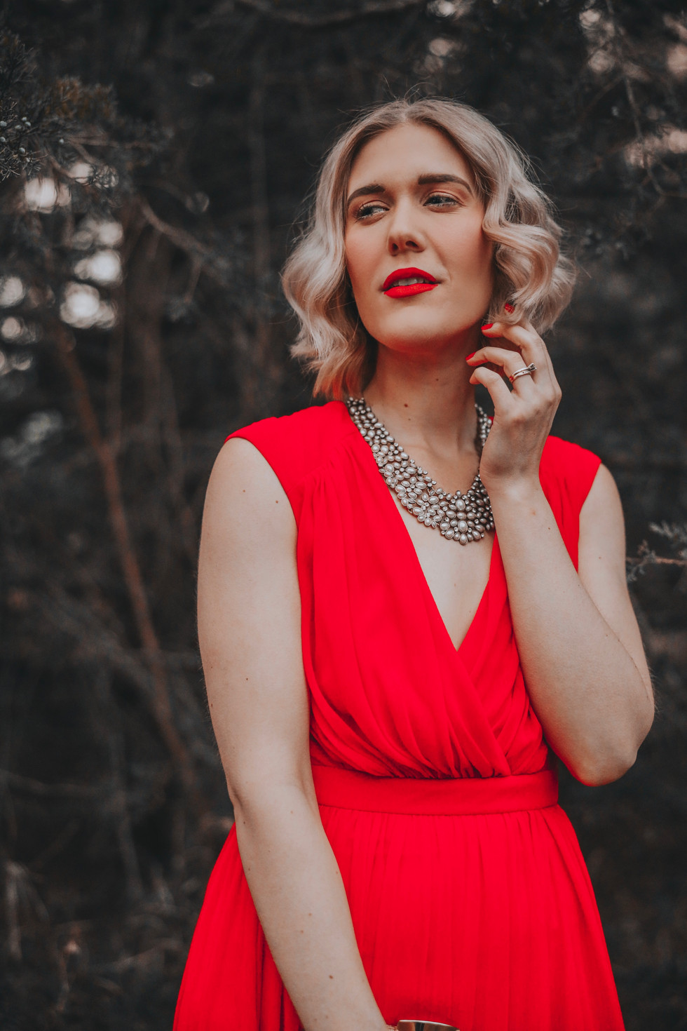 Feeling fabulously festive in today's look! For day 14 of my 25 days of holiday style, I wanted to style a more dressy holiday outfit to have you covered for any event this season! I always use Rent the Runway for special events. This particular Badgley Mischka dress can be rented for only $65! I love its red color and flattering silhouette! I styled the dress with my favorite heels for the season from Betsey Johnson, a gold clutch from Nordstrom, and a beautiful statement necklace.