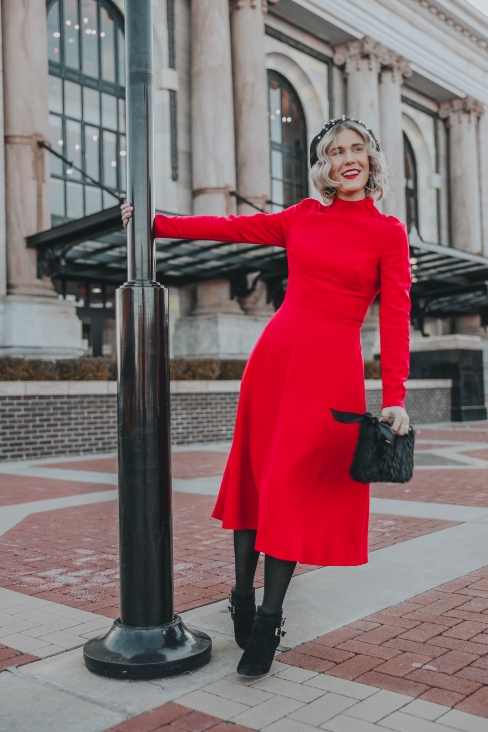 This dress from Rent the Runway is so magical and amazing for the Christmas season! While I didn't discover that it was technically pink until after this shoot, it totally comes off as red (to me) both in my pictures and in person! How weird is that?! Either way, it ended up being one of my favorite looks, so far, for this series! I love the classic silhouette and the little touch of the buttons on the shoulder.