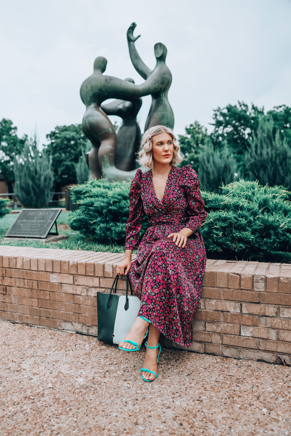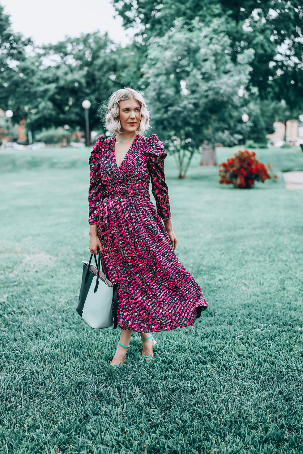 Shop the Look: Rent the Runway Kate Spade New York Marker Floral Devore Dress, Kate Spade New York Marker Floral Devore Dress (on sale!), similar here and here, Rent the Runway Kate Spade New York Evergreen Nicole Colorblock Tote, similar here, here, and here, similar heels here, here, here, and here, Violet & Brooks Viola Bow Hair Clip Trio, similar here, H&M 4 Pairs Earrings, Kylie Cosmetics Creme Lipstick in Passion