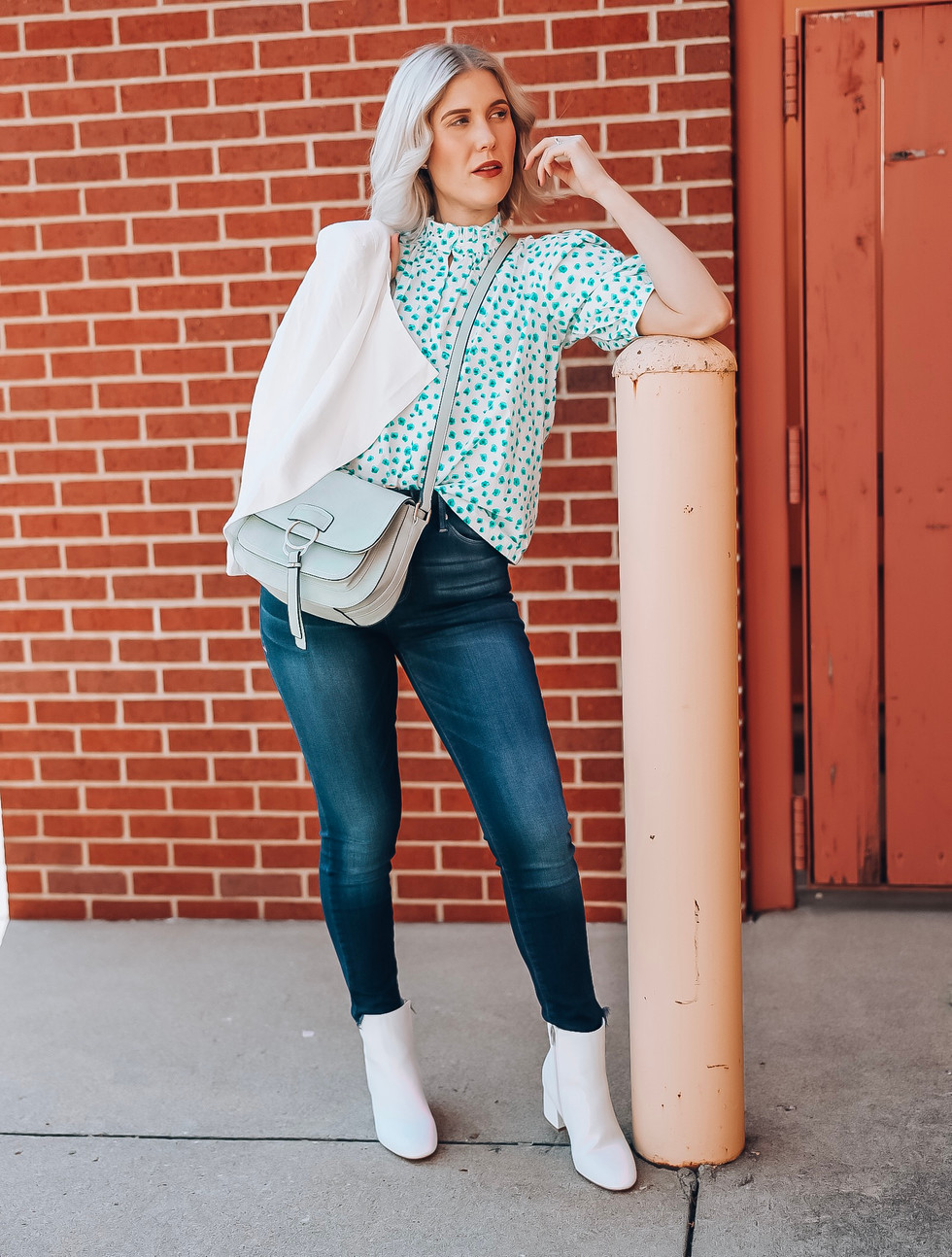 Shop the Look: Rebecca Taylor Emerald Daisy Poplin Top in Cream Combo, similar here and here, similar jeans here and here, Vici Up to the Task Pocketed Assym Jacket, similar here, similar crossbody bag here, Chinese Laundry Davinna Bootie, similar here, Kate Spade Say Yes "Love" Pave Studs, similar here, Bite Beauty Amuse Bouche Lipstick in Pepper